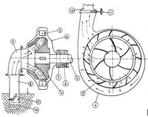 Çark; çark kanatlara verilen bir isim olup bu kanatlar yardımıyla hidrolik enerjiye dönüştürülen mekanik enerji için tabir yerinde ise teğetsel bir hız kazandırma yeridir. Salyangoz; pompanın tahliye borusuna sıvının akıtımını yapan parçadır. Difüzör; salyangozla çark arasındaki yüksek hızlı sıvın kinetik enerjisini basınca çeviren parçanın adıdır. Salmastra kutusu; milin gövde arasındaki yerlerde meydana gelmesi muhtemel kaçakları tıkamak için gerekli olan parçadır.